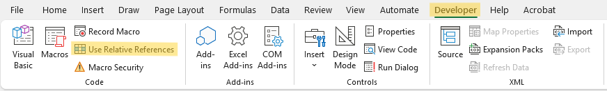 Untuk mengaktifkan relative reference, Anda cukup mengklik tombol Use Relative Reference di tab Developer sebelum Anda mulai merekam.