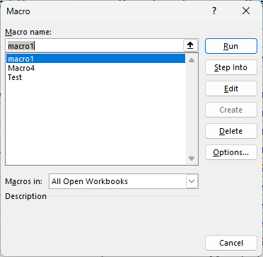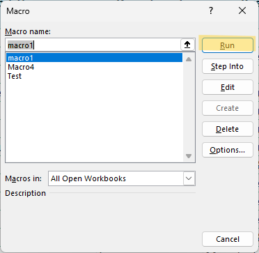 - Macros in merupakan dropdown dengan dua nilai: This workbook dan All Open Workbooks, merupakan menu untuk memfilter daftar macros yang ditampilkan, apakah Excel menampilkan hanya macros dari workbook Anda saat ini atau apakah Excel harus menampilkan semua macros yang tersimpan di semua Workbooks yang sedang terbuka.