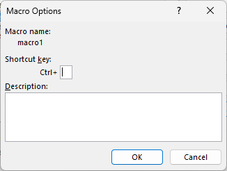 - Macro Name merupakan nama macro yang akan dibuat. Nama macro harus dimulai dengan huruf atau underscore (_), tidak mengandung spasi atau karakter khusus (!, @, &, $), serta tidak melebihi 255 karakter. Nama macro bersifat unik sehingga tidak boleh ada dua macro dengan nama yang sama.TipsNama seperti macro1 dapat digunakan, tapi sebaiknya gunakan nama yang lebih deskriptif yang menjelaskan apa yang dilakukan oleh macro tersebut.