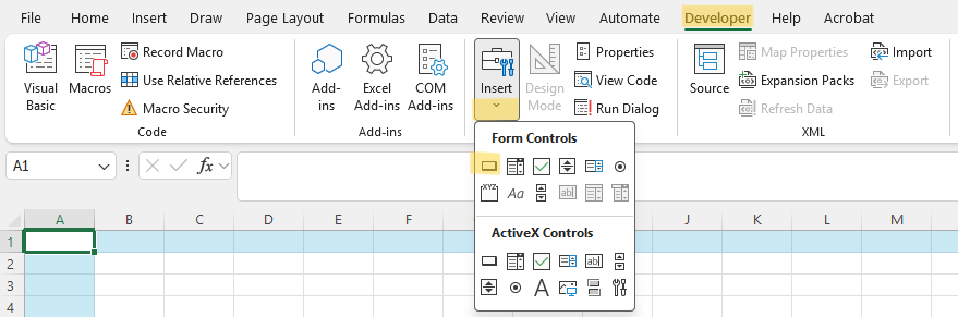Klik tab Developer → Insert → Button (Form Control)