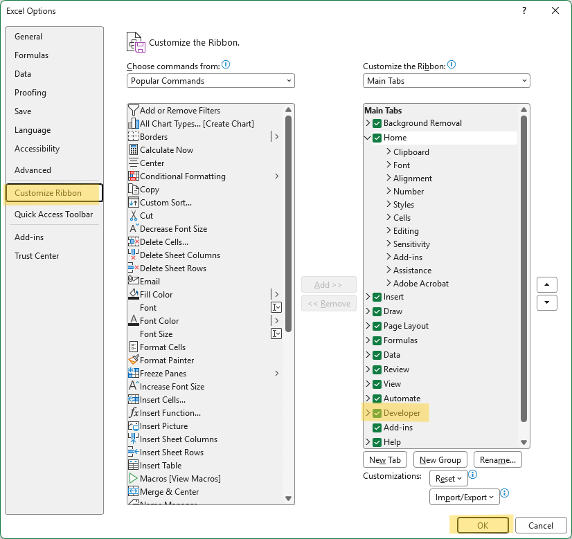 - Akan muncul window berikut ini. Pada panel kiri, pilih Customize Ribbon. Setelah itu, centang kotak Developer.