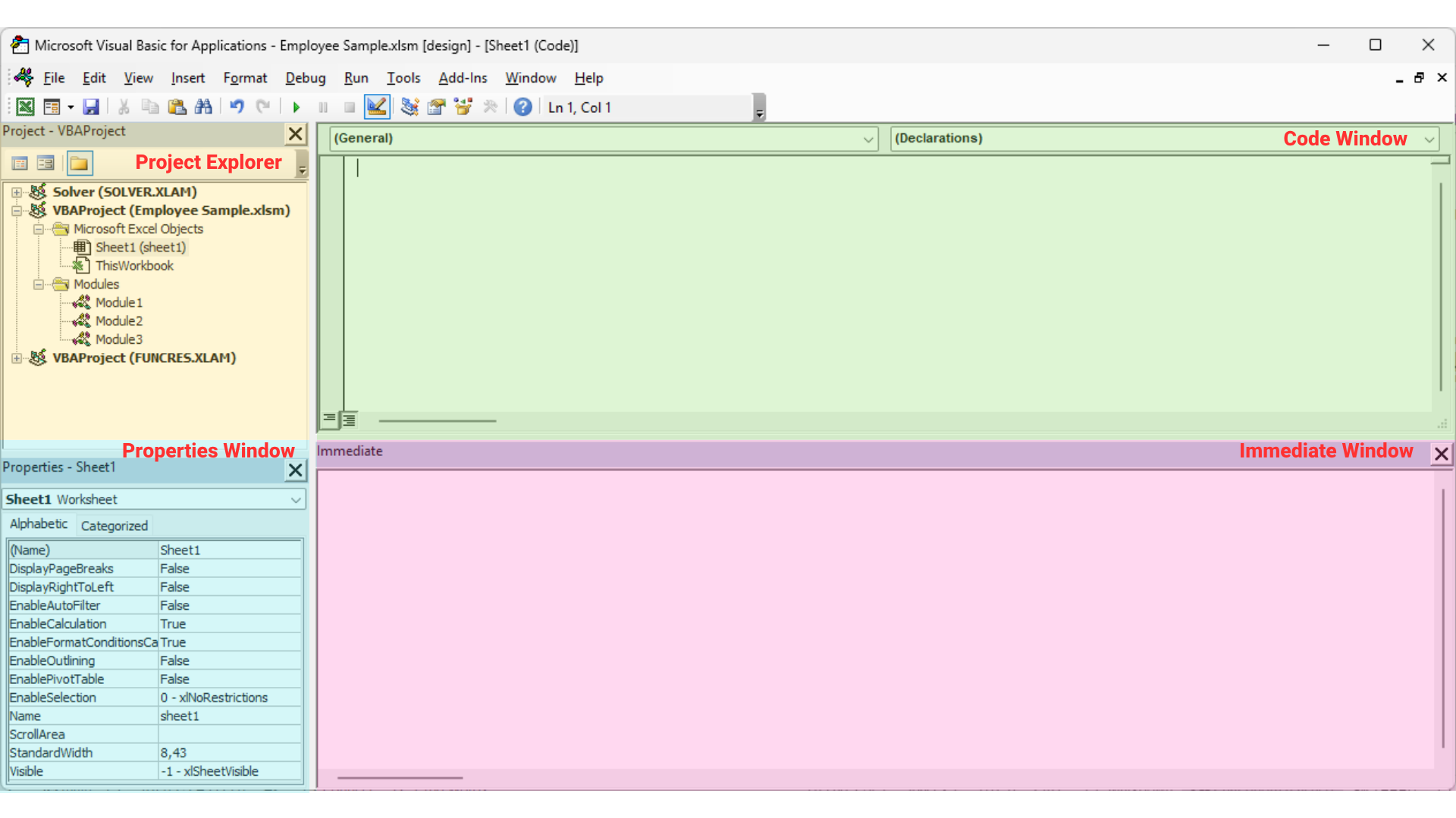 Terdapat beberapa bagian utama yang perlu Anda ketahui dari jendela VBA Editor: