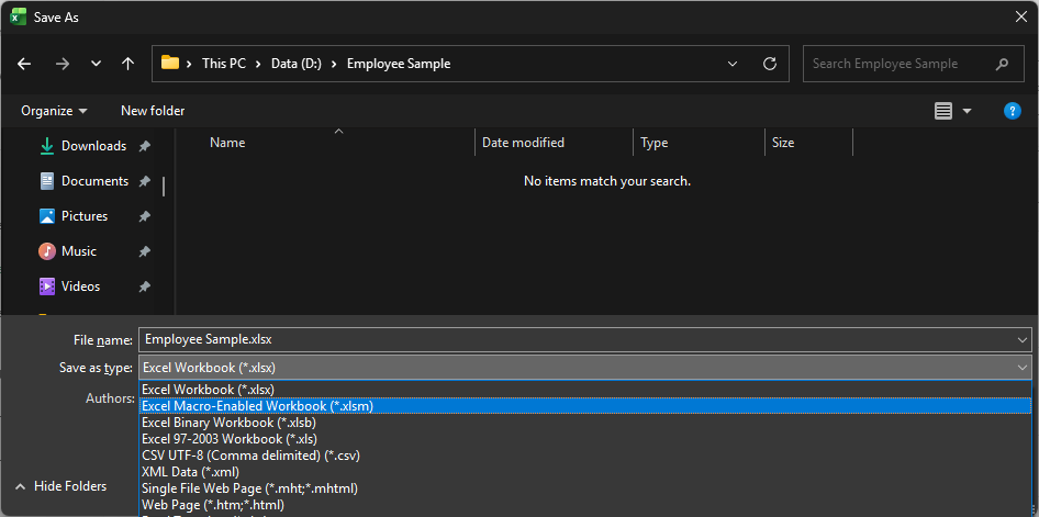 File Excel biasa, yaitu file berformat .xlsx, tidak bisa menyimpan Macro. Oleh karena itu, jika Anda menggunakan Macro dalam sebuah workbook, maka Anda harus menyimpannya sebagai file .xlsm (Excel Macro-Enabled Workbook). Anda cukup menyimpannya seperti biasa menggunakan File → Save/Save As, kemudian pada bagian Save as Type, pilih Excel Macro-Enabled Workbook (*.xlsm) kemudian Save.
