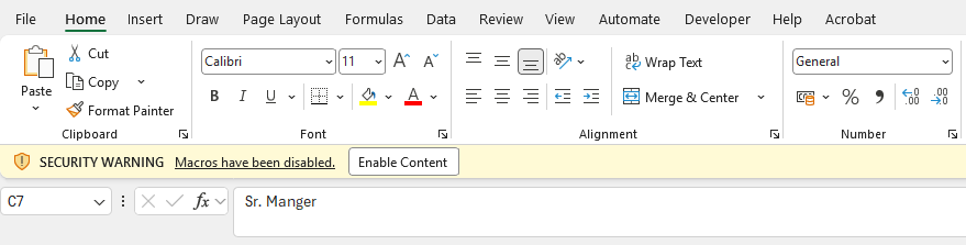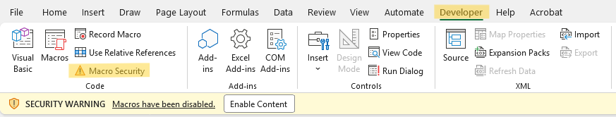 Anda dapat mengklik tombol Enable Content untuk menggunakan Macro. Selain itu, Anda dapat mengubah pengaturan terkait Macro di tab Developer → Macro Security.