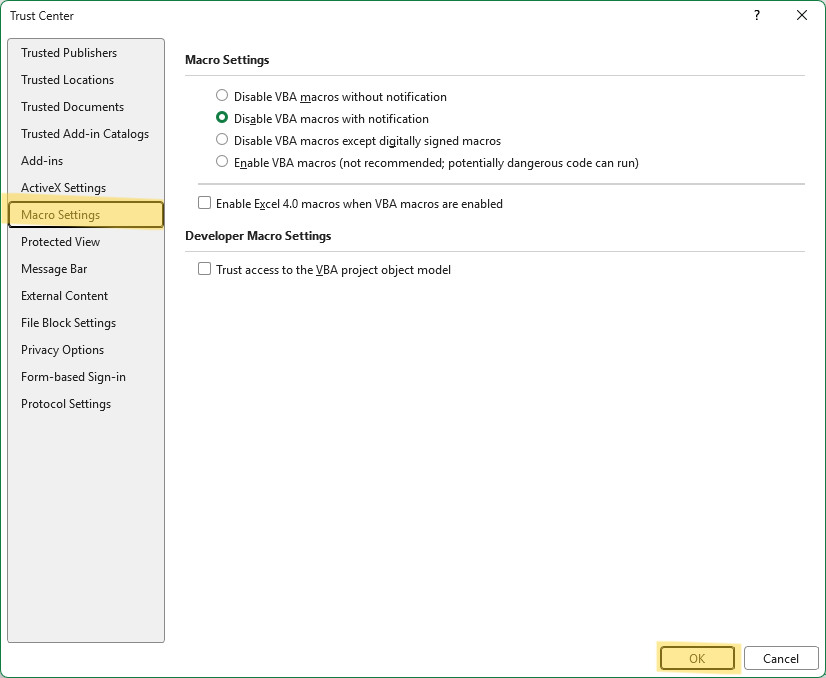 - Disable VBA macros without notification: semua macros diblokir total tanpa notifikasi