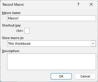 Record Macro: Langkah 2 Terdapat beberapa poin penting dari kotak dialog ini: