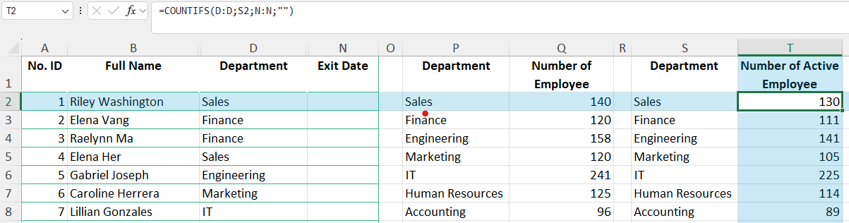 - Hitung hanya karyawan aktif — yang tidak memiliki nilai di kolom Exit Date (kolom N)