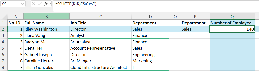 Menghitung jumlah karyawan sama dengan menghitung jumlah baris per departemen. Karena kolom departemen berisi data kategori, Anda bisa menggunakan fungsi COUNTIF(). Untuk menghitung karyawan berdasarkan departemen tertentu, gunakan formula: