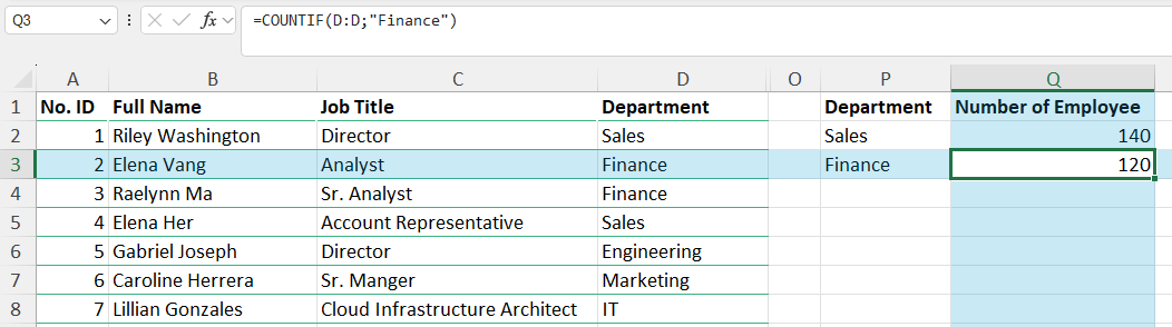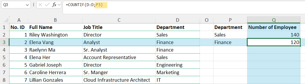 Namun, Anda akan menyadari bahwa harus mengganti nilai departemen secara manual di setiap formula. Cara yang lebih efisien adalah menggunakan referensi sel. Alih-alih mengetik “Finance” secara manual, gunakan referensi sel seperti P3 yang berisi nilai “Finance”. Lihat perbedaannya di gambar berikut: