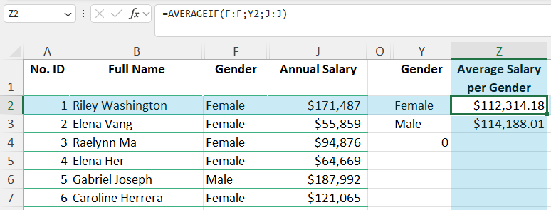 Untuk mencari rata-rata gaji berdasarkan gender, gunakan fungsi AVERAGEIF(). Dalam kasus ini, kondisi didasarkan pada kolom Gender (kolom F):