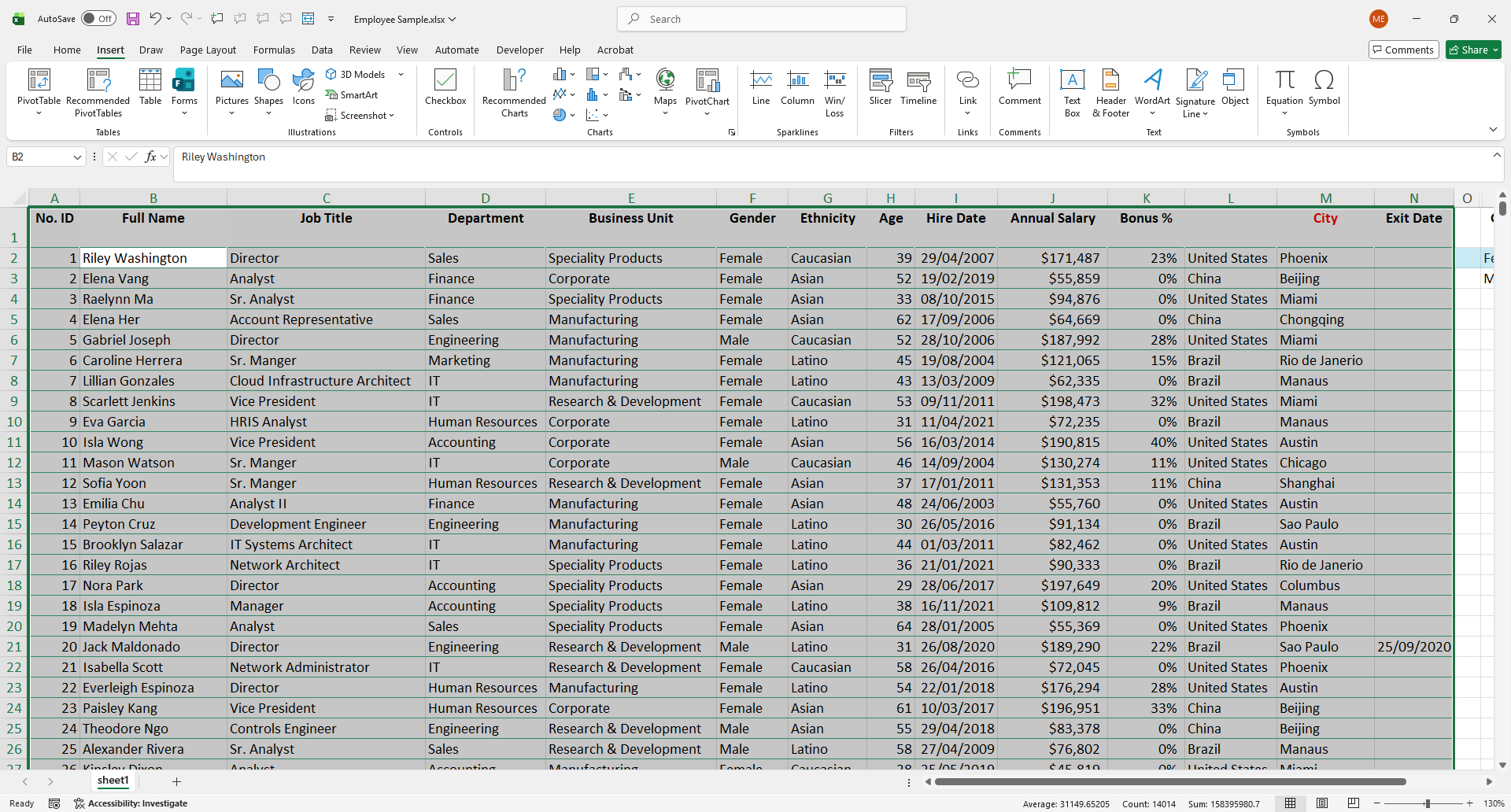 | No. ID | Full Name | Job Title | Department | Business Unit | Gender | Ethnicity | Age | Hire Date | Annual Salary | Bonus % | City | Exit Date |