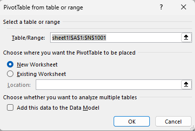 - New Worksheet/Existing Worksheet: Pilih tempat hasil Pivot Table disimpan