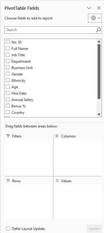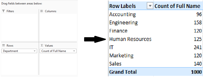 Untuk menjawab pertanyaan pertama (jumlah karyawan per departemen), seret kolom Department ke area Rows dan kolom Full Name ke area Values
