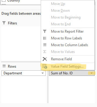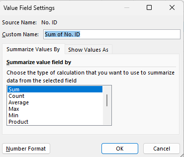 COUNT. Jika Anda menggunakan No. ID (data numerik), Excel akan menggunakanSUM.Ubah fungsi jika diperlukan dengan mengklik panah kecil di samping nama kolom di area Values, kemudian pilih Value Field Settings
